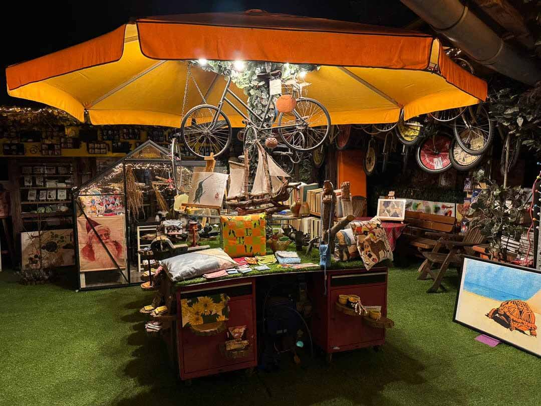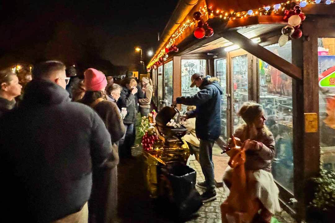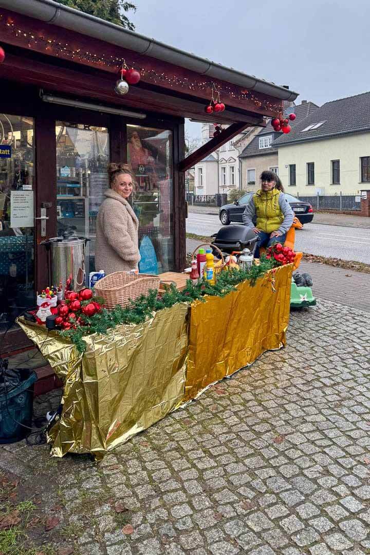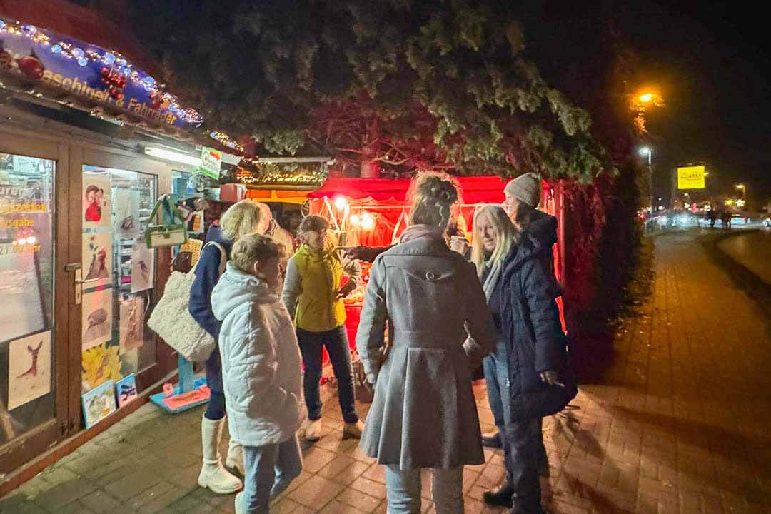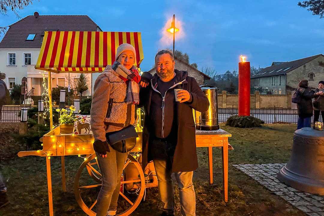 Zeitgleich öffnete Wolfgangs Galerie auf der anderen Seite des Platzes. Dort gab es Thüringer Bratwürste – der Elektrogrill kam den Bestellungen kaum hinterher – sowie zusätzlichen Punsch und Glühwein. Die Galerie war durchgehend gut besucht. Viele Gäste ließen sich von Wolfgangs Werken begeistern und bewunderten den fein arrangierten Stand mit der Nähkunst seiner Frau Ute.
