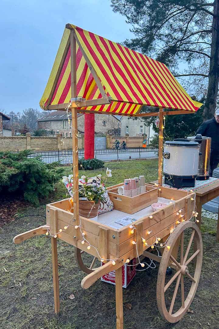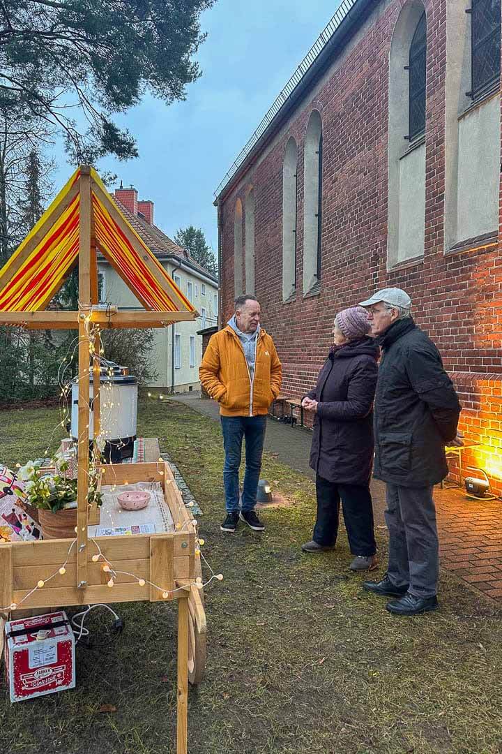 Vor der Kirche wartete ein liebevoll gestalteter Holzwagen, auf dem Glühwein und Punsch ausgeschenkt wurden. Die Getränke wurden vom Gewerbeverein und von netzgewinn gespendet. Antonia schmückte den Wagen mit warmen Lichtern, einer Christrose und einem Kissen aus dem Stoff von Wolfgangs Bild „Planet Pille Palle“. So entstand bereits vor Beginn des Programms eine stimmungsvolle Atmosphäre.